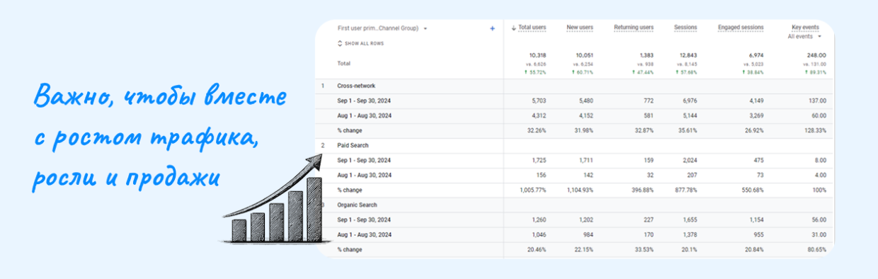 Если трафик растет, а продаж нет, то возможные причины: сайт попал в топ по неподходящим запросам, сломалась форма заказа, испортилась скорость загрузки на мобильных телефонах. Каждую гипотезу нужно проверить.