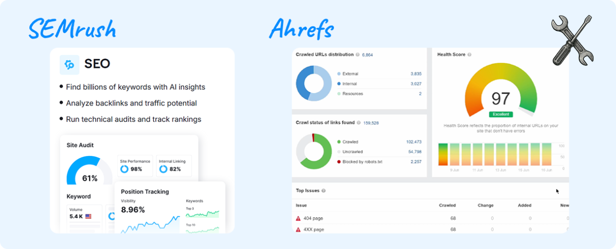 Выбор инструментов зависит от бюджета и задач. Небольшому бизнесу хватит бесплатных Google Analytics и Search Console. Крупным проектам нужны профессиональные платформы для глубокого анализа.